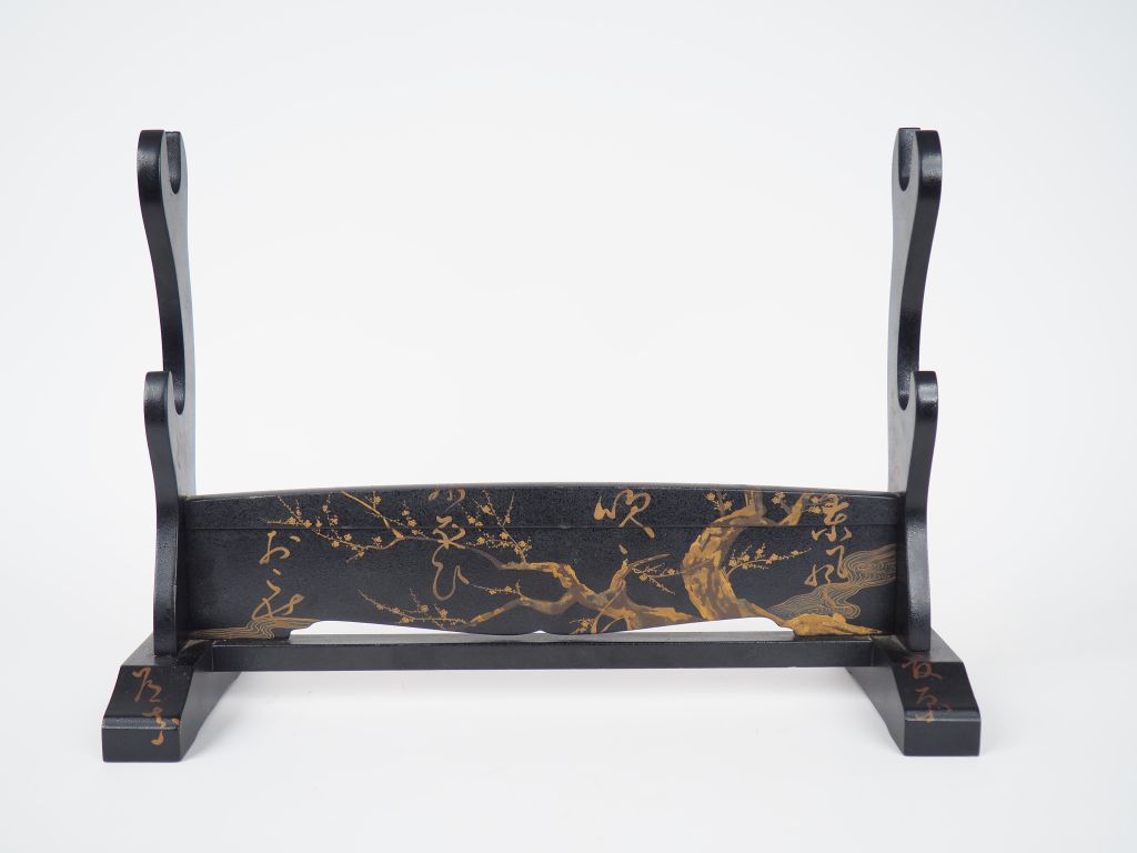 Japon, vers 1900. KATANA-KAKE Porte sabres à deux niveaux, en bois laqué noir, à décor de prunus en fleurs laqué or. (Petits accidents)