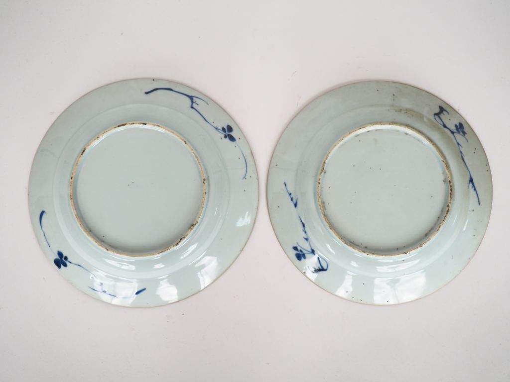 Japon, vers 1900 Paire d’assiettes en porcelaine émaillée bleu, blanc et rouge de cuivre à décor de deux jeunes femmes conversant sur une terrasse. Diam. 21,5 cm