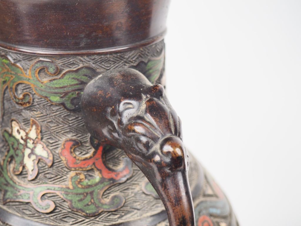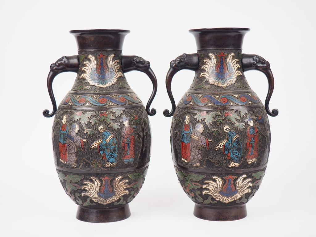 Japon, vers 1900, Paire de vases de forme balustre en bronze et émaux champlevés à décor de personnages. Anses zoomorphes. H. 40 cm