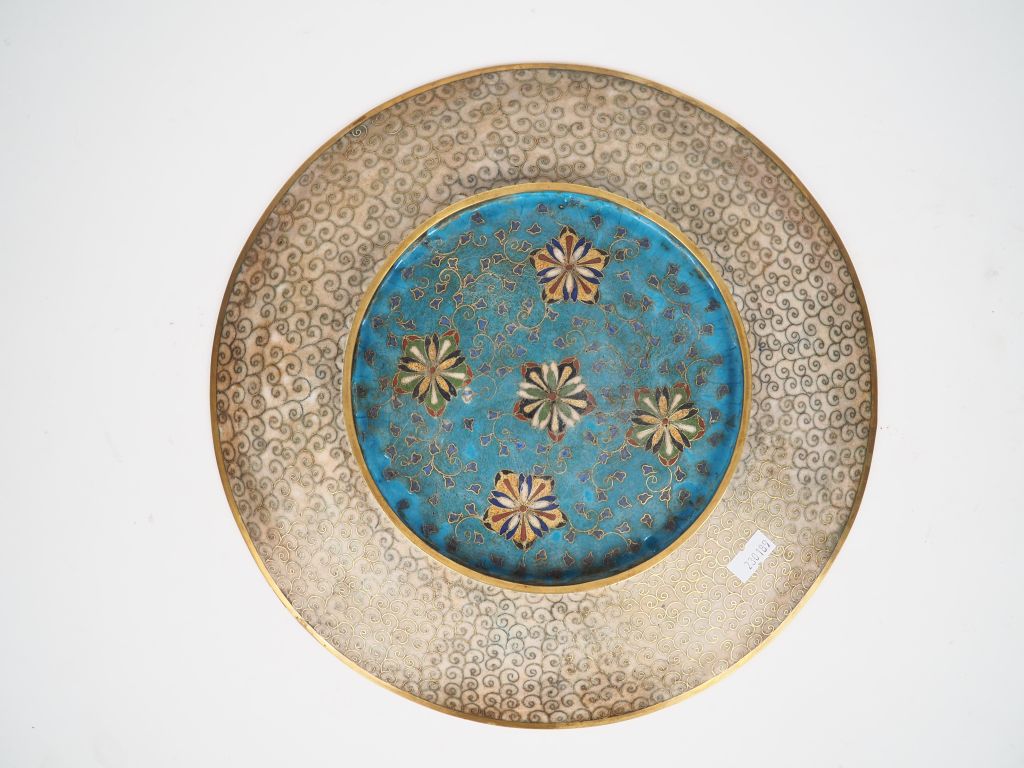 Japon, vers 1900 Plat en émaux cloisonnés sur cuivre, à décor en trois médaillons d’une grue, deux petites cailles et fleurs de chrysanthèmes épanouies, reposant sur un fond de spirales et motifs géométriques. Le revers à décor en médaillon central de fleurs épanouies sur fond turquoise, le pourtour orné de volutes. D. 30 cm
