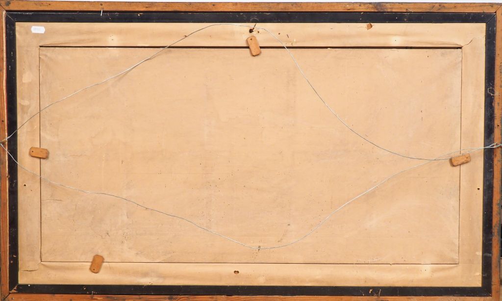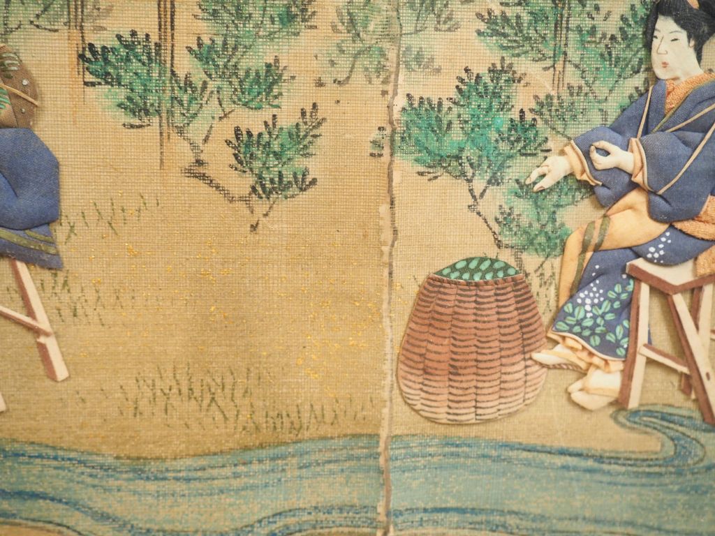 Japon, vers 1900, Une tenture sur soie contrecollée sur papier à décor de personnages s’adonnant à la cueillette et au traitement des récoltes. Encadrée sous verre. Dim. à vue. 41,5 x 79 cm