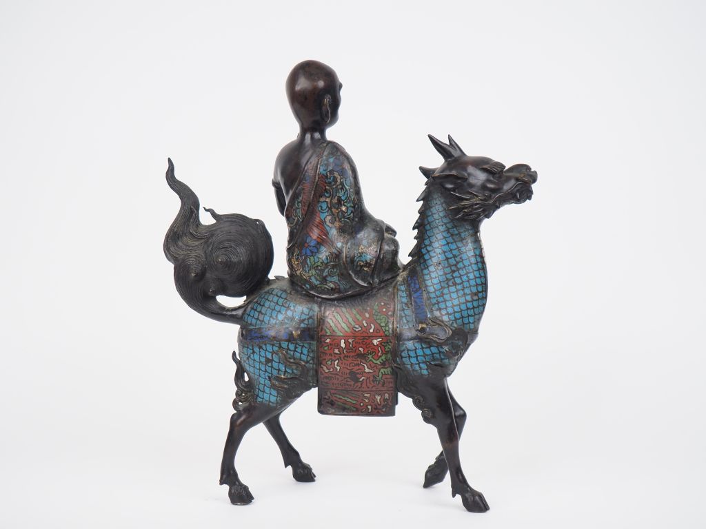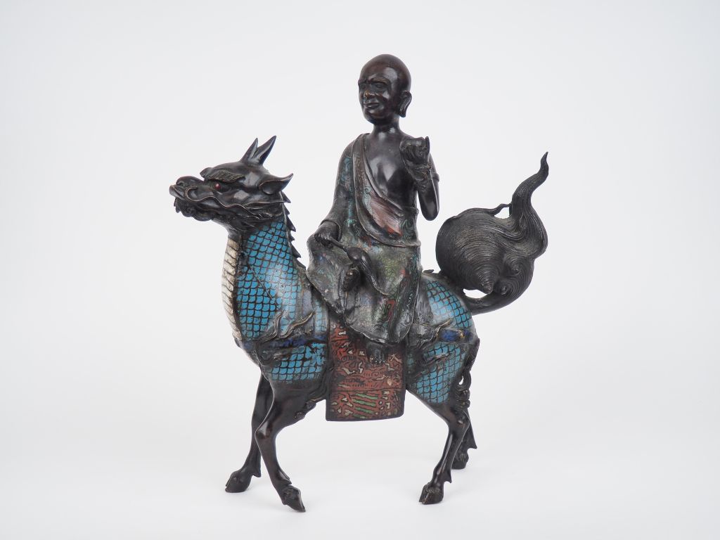 Japon, vers 1920, Groupe en émaux champlevés, représentant un moine sur un kirin tenant un chasse mouche et un bol à aumône. Dim. 45 x 38 cm