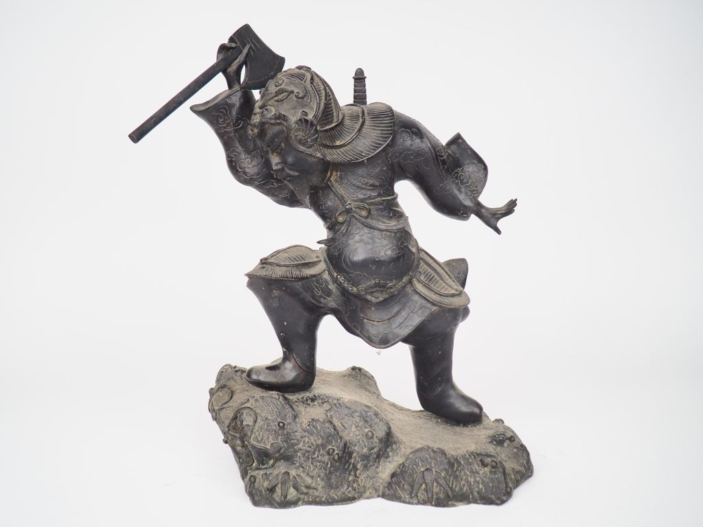 Japon, XIXe siècle, Statue en bronze à patine brune représentant un guerrier en armure. H. 34 cm