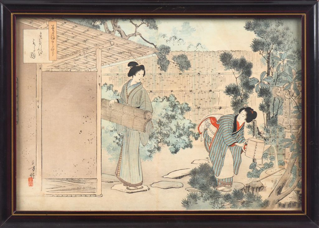 Japon XIXe-XXe siècle, Mizuno Toshikata (1866-1908) Estampe yoko-e titrée "Chanoyu Hibi-gusa », pratique quotidienne de la cérémonie du thé. Dim à vue. 21 x 27,5 cm