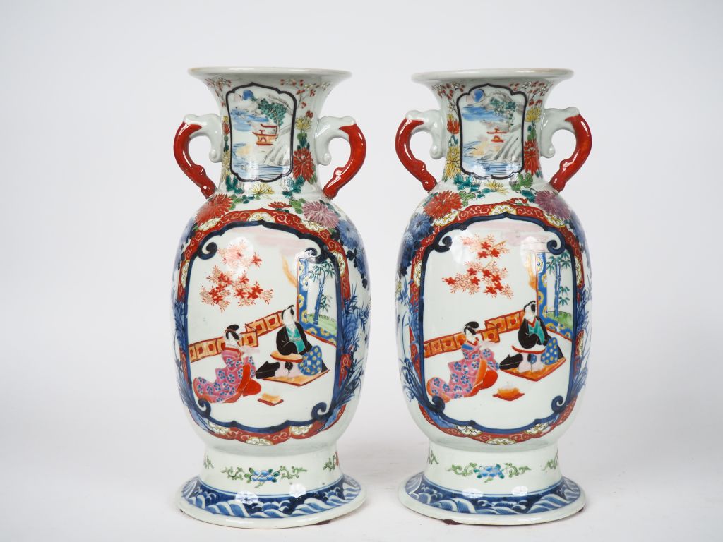 Japon XXe siècle. Paire de vases de forme balustre à décor de daymio et Geisha, fleurs de chrysanthèmes et scènes paysagées. Signés. H. 38 cm (petit manque sur la coiffe)
