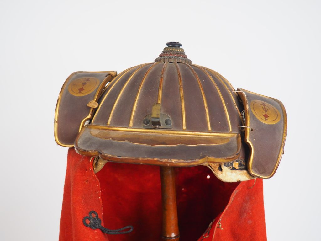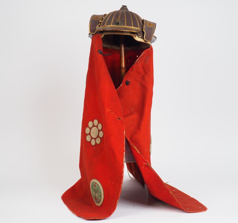 Kaji kabuto, casque de pompier, avec sa cape, le casque de type suji-bashi, laqué brun, les côtes et les bords soulignés d’un filet doré, deux fukigaeshi encadrant la visière , la cape en feutre rouge rehaussée de plusieurs Mon se détachant en blanc. Japon, XIXème siècle. H. cape : 67 cm (lacunes de laque et accidents sur le casque, fukigaeshi à refixer , cape tachée, trouée)