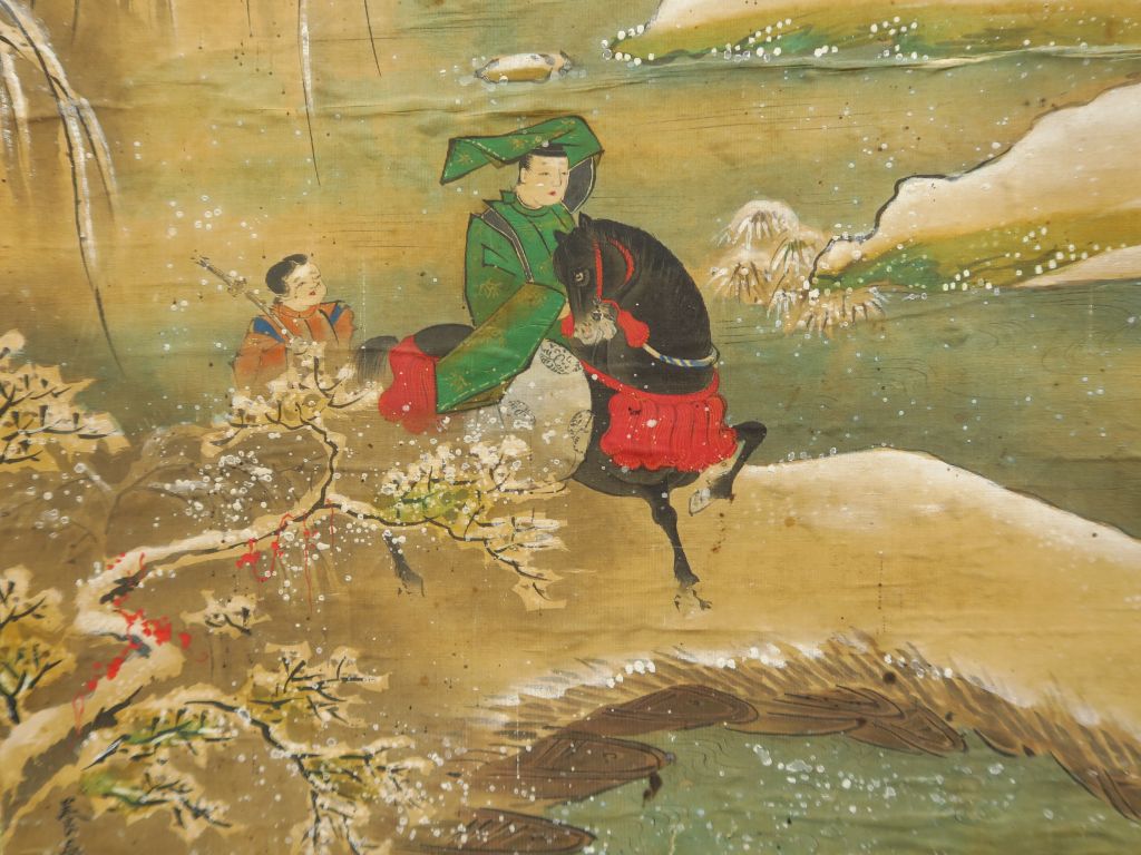 Kakemono au lavis et couleurs sur soie représentant un jeune homme à cheval suivit de son serviteur portant son sabre, voyageant dans un paysage de neige où montagnes et arbres émergent de nuages. Signé Yôshun Fujiwara Ichô ? Japon, fin XVIIIe-XIXe siècle (Usures, plis, taches) Dim. 107 x 38 cm.
