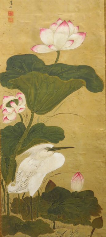 Kakemono peint couleur sur soie représentant un héron blanc se tenant auprès de grandes feuilles et fleurs de lotus. Signé Henkô (possiblement Watanabe Sekisui, 1775-1833) Avec titre : Kôrai Shujitu, « le bonheur vient d’un jour d’automne » Japon, fin XVIIIème - début XIXème siècle (Usures, quelques déchirures) Dim. 104 x 31,5 cm.