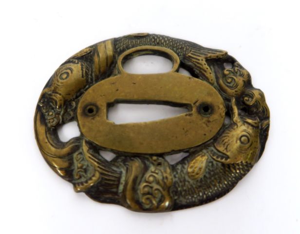 Kanamono en forme de tsuba, en sentoku à décor de deux carpes dans les flots. Japon, fin XIXe siècle. Larg.