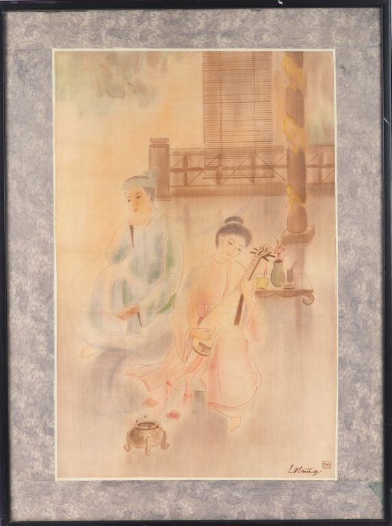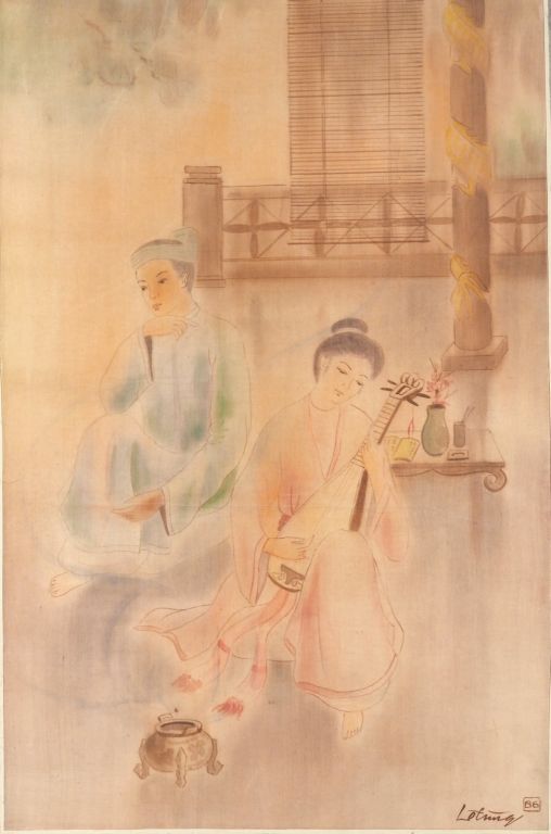 LE TUNG "Scène galante". Aquarelle sur soie, signée en bas à droite 62 x 41 cm