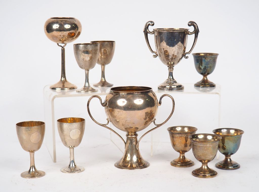 Lot comprenant : 3 coupes sur pied, deux différentes séries de 4 verres à liqueur. Poids : 510 g.