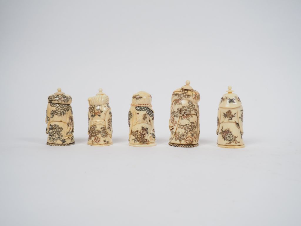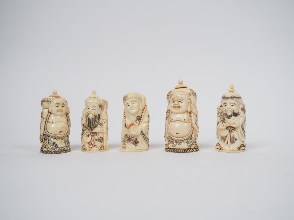 Lot comprenant cinq tabatières en os prenant la forme de personnages. H. 8 cm et 9 cm (manque un couvercle)