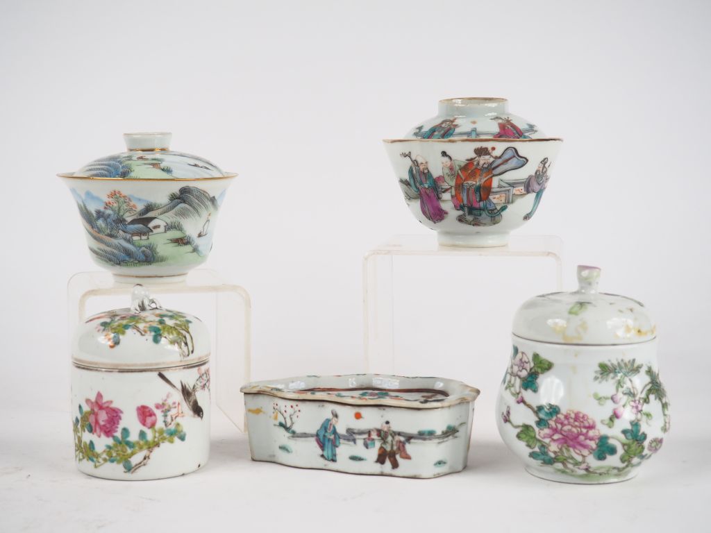 Lot comprenant deux coupes couvertes, 2 vases couverts, une cage à criquets Chine XIXème Tongzhi (faible égrenure)