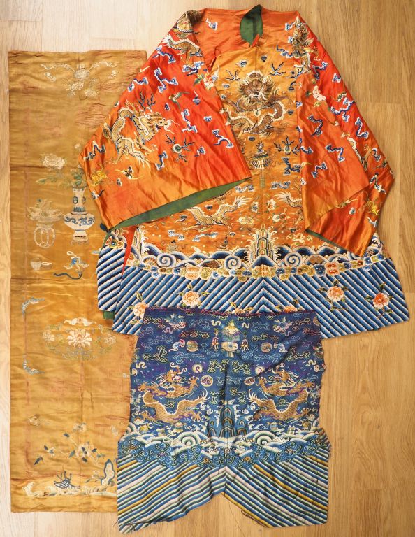 Lot comprenant : - Robe chinoise fin du XIXème en soie et lin brodé sur fond corail décor de dragons, de nuages et de pics montagneux. (ensollée) - Elément de vêtement en Kesi - Panneau en soie et lin brodé