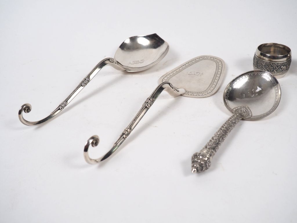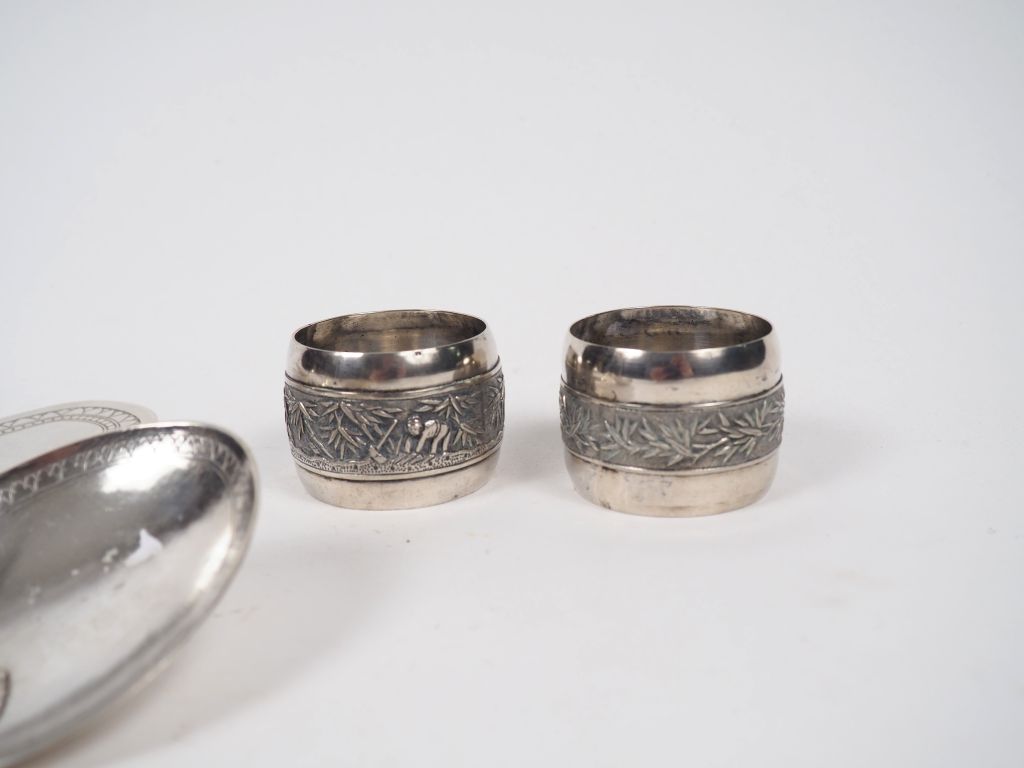Lot comprenant : trois différentes cuillères décoratives et une paire de ronds de serviettes en argent. Vietnam, vers 1920. Poids. 540 g