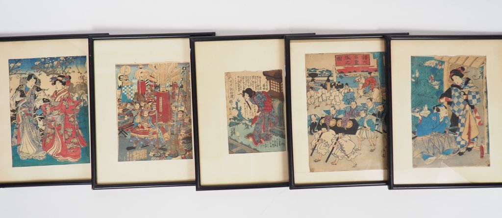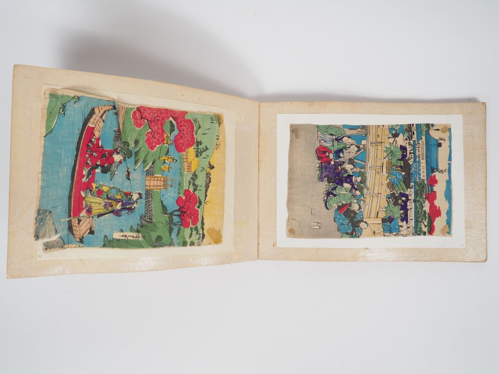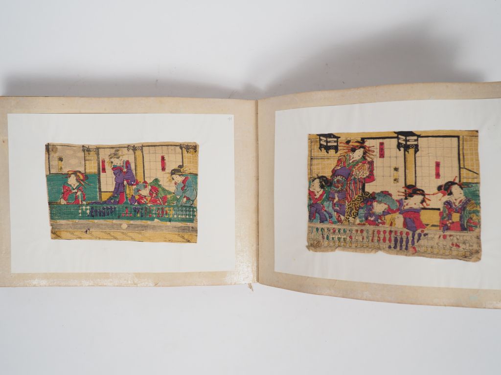 Lot comprenant : - un album contenant des estampes sur crépon - une suite de douze encadrements contenant des estampes sur crépon. Japon, vers 1920.