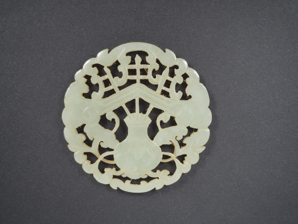 Lot comprenant : - un pendentif en jade céladon, à décor d'objets mobiliers, - un pendentif en jadéite centre mobile, - un pendentif en stéatite, à décor de dragons. Chine, XIXème siècle. Diam. 5 cm à 5,7 cm.