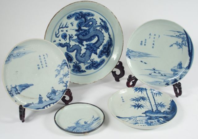 Lot de cinq porcelaines bleu blanc de Hue, comprenant une grande coupe à décor d’un dragon poursuivant la perle sacrée avec marque d’appréciation , deux coupes à décor d’ermites sur les bords d’un fleuve et poèmes calligraphiés avec marque Jing Shan Dian Yu , une coupe à décor de deux daims près d’un rocher et bambous , une coupe à décor d’un pêcheur, avec marque apocryphe Xuande. Hue, XVIIIe siècle (Petites égrenures, importante restauration à l’une, fel de cuisson à l'une, accidents) Diam. 18,7 à 25 cm VENDUES SUR FOLLE ENCHERE