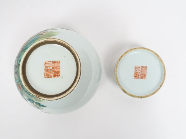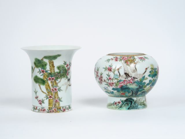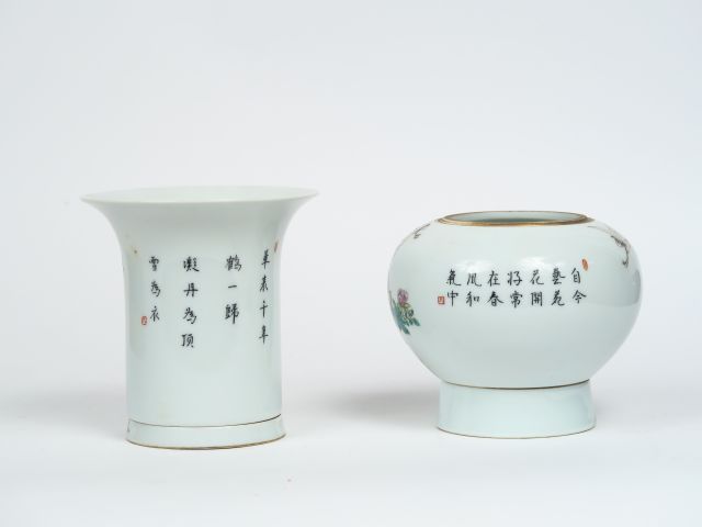 Lot de deux vases en porcelaine et présentoir en porcelaine famille rose, décor d'échassier et fleurs. Chine marque apocryphe moderne. H. 11 et 8,5 cm