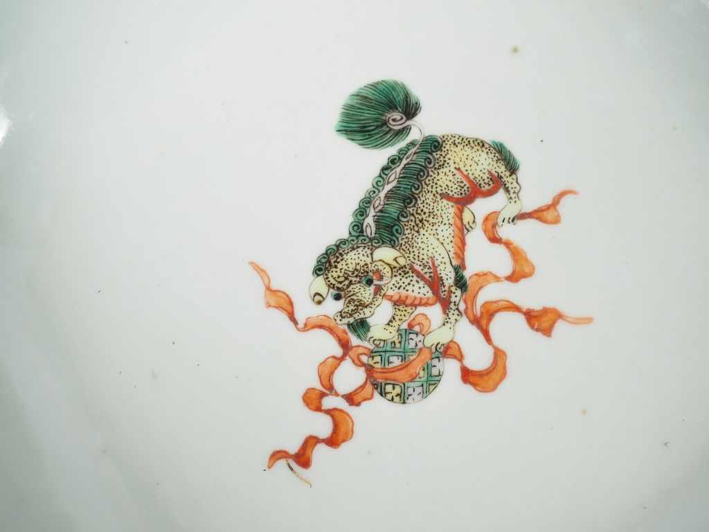 Lot de trois coupes en porcelaine dans le style de la famille verte, l'une à décor des huit immortels sur fond craquelé beige, les deux autres à décor de dragons et jeux d'enfants. Chine, XXème siècle. Diam. 28 cm et 23 cm