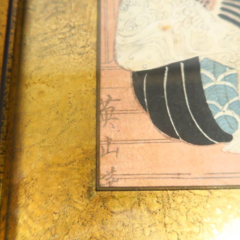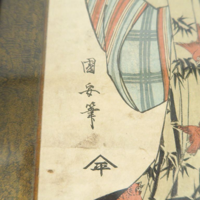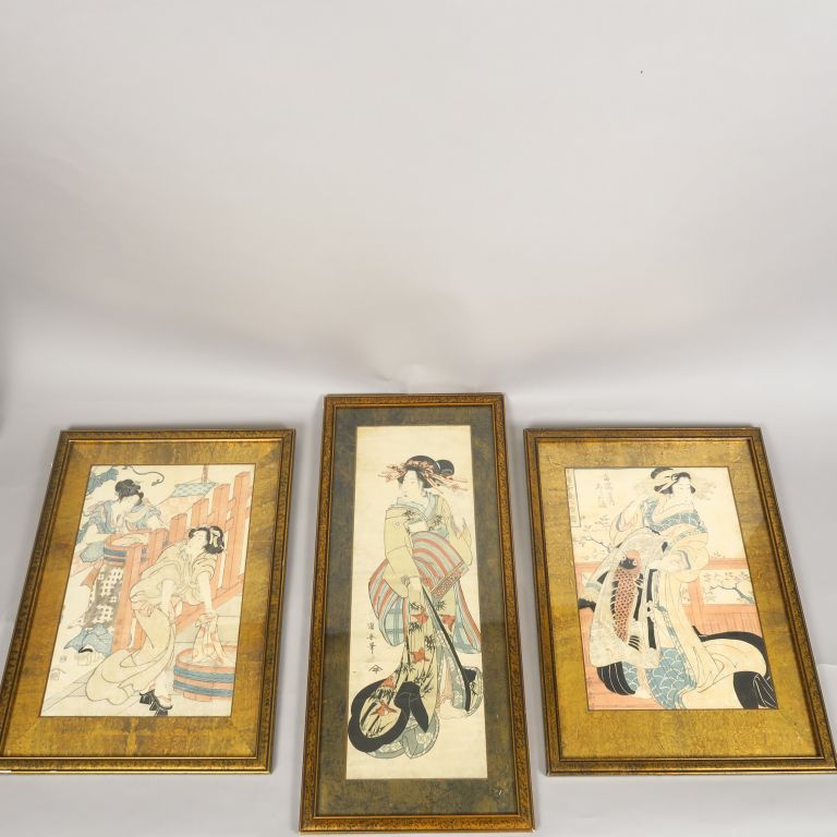 Lot de trois estampes, dont : - KUNIYASU, format hosoban, courtisane en pied , - Eizan, format oban, Courtisane en pied , - Lavandières (nom de l’artiste masqué). Japon, première moitié du XIXème siècle. (Insolées, jaunies, encadrées sous verre)