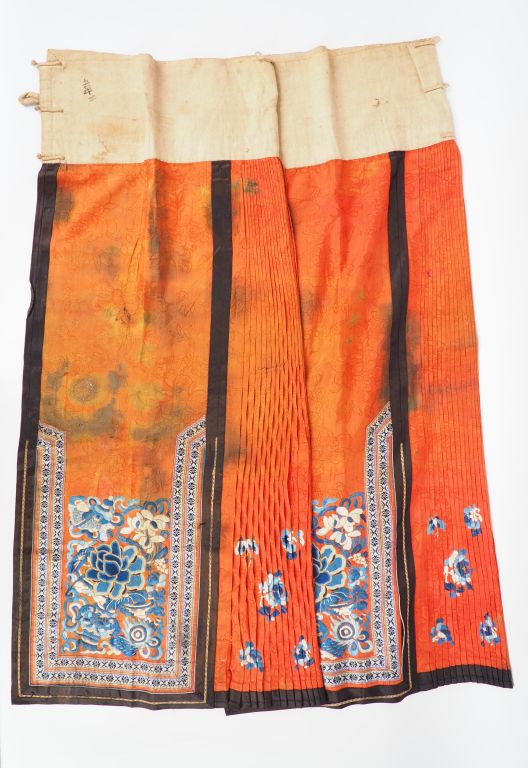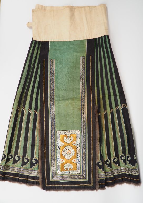 Lot de trois jupes, dont une jupe d’hiver en soie verte au plissé souligné de noir, le pan frontal et le bas bordé de fourrure , une jupe en deux parties, en soie damassée rouge brodée de fleurs et papillons en camaïeu de fils bleus , une jupe en crêpe de soie bleu brodée de fleurs et chauves-souris. Les trois jupes avec ceinture en lin. Chine, première moitié du XXème siècle. H. totale : 80 cm - 75 cm (la doublure de la première tachée , nombreuses taches et décolorations aux deux dernières)