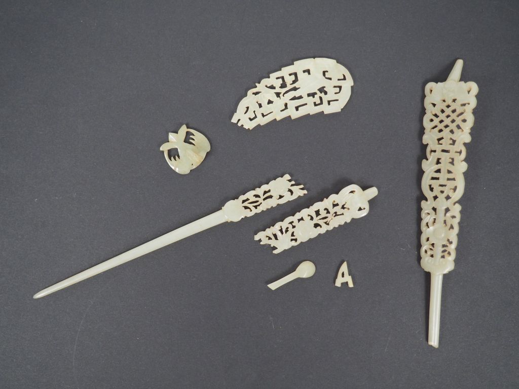 Lot d'éléments de coiffe en jade céladon finement ciselé. Chine, XVIIIème siècle. (un accidenté)