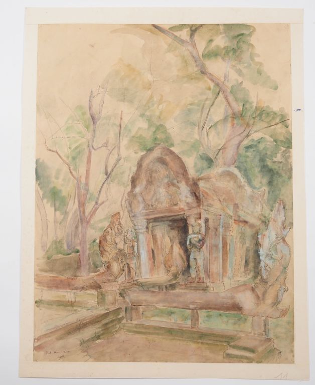 Louis Robert BATE (1898-1948, grand prix de l'Indochine en 1938). "Entrée de Preah Khan, Angkor". Encre et couleur sur papier, signée et situé en bas à gauche. Dim. 65 x 49 cm.