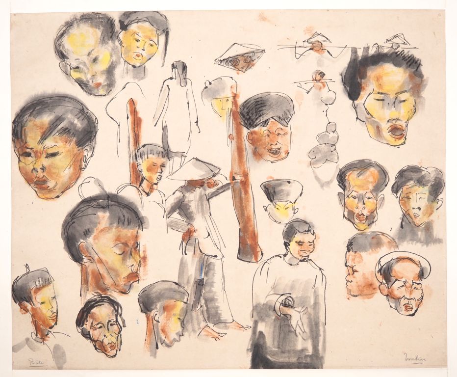 Louis Robert BATE (1898-1948, grand prix de l'Indochine en 1938). "Etude de personnages du Tonkin". Encre et couleur sur papier signée en bas à gauche et située en bas à droite. Dim. 39 x 47,5 cm. (Petites usures).