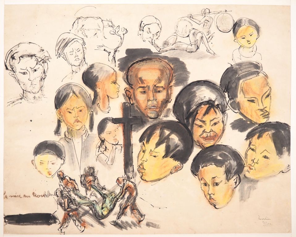 Louis Robert BATE (1898-1948, grand prix de l'Indochine en 1938). "Etude de visages de tonkinois". Encre et couleurs sur papier signée et située en bas à droite. Dim. 39,5 x 49 cm.