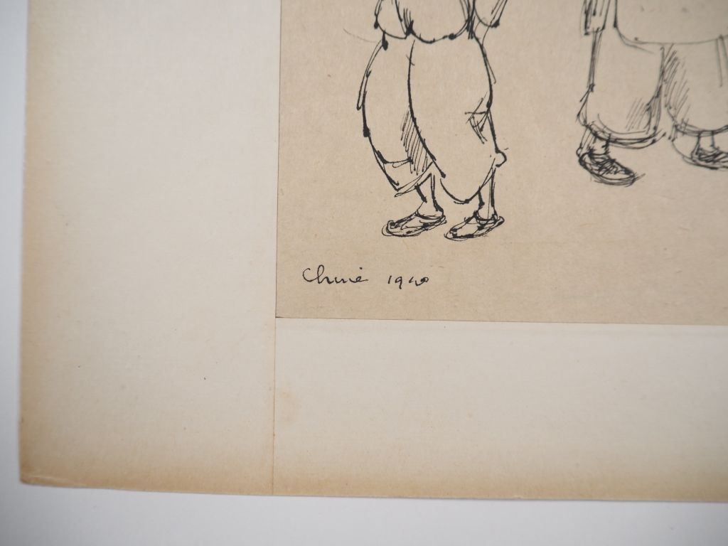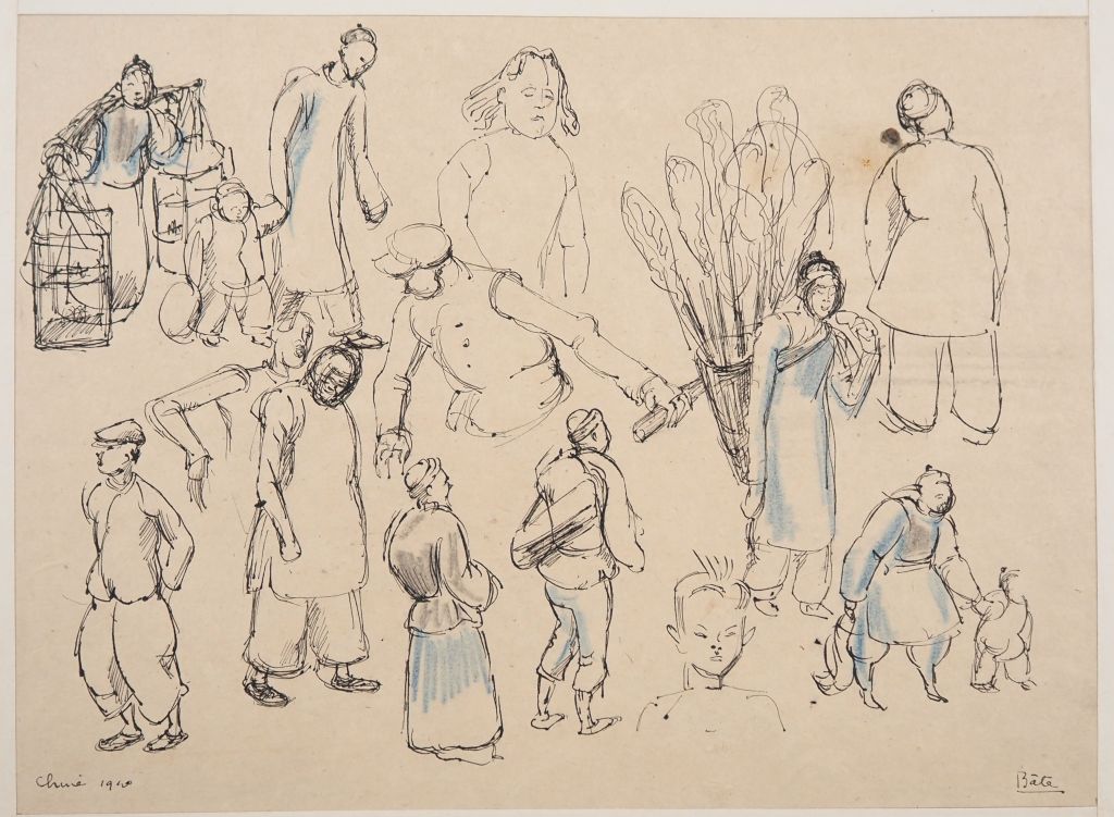 Louis Robert BATE (1898-1948, grand prix de l'Indochine en 1938). "Etude de personnages, Chine 1940". Encre et couleurs sur papier. Dim. 22,5 x 30,5 cm.