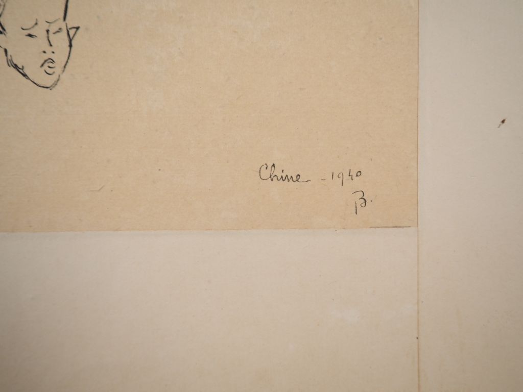 Louis Robert BATE (1898-1948, grand prix de l'Indochine en 1938). "Etude de têtes de personnages chinois". Encre sur papier signée en bas à droite et datée 1940. Dim. 30 x 19 cm.