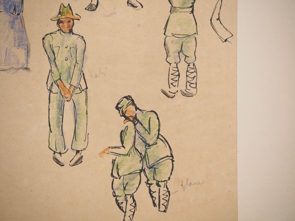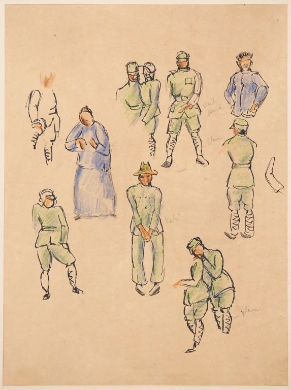 Louis Robert BATE (1898-1948, grand prix de l'Indochine en 1938). "Militaires chinois". Encre et couleurs sur papier. Dim. 25,5 x 19 cm.