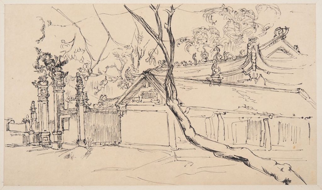 Louis Robert BATE (1898-1948, grand prix de l'Indochine en 1938). "Pagode". Encre sur papier. Dim. 19,5 x 33 cm.