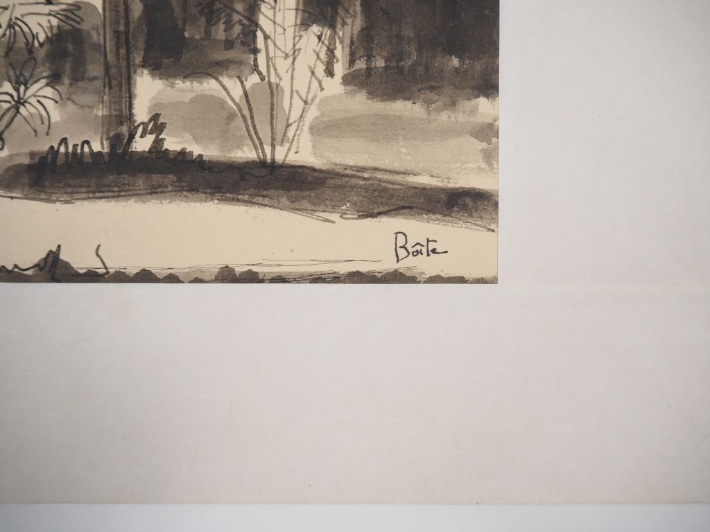 Louis Robert BATE (1898-1948, grand prix de l'Indochine en 1938). "Paysage arboré d'Asie du sud". Encre et aquarelle sur papier. Dim. 21,5 x 43,5 cm.