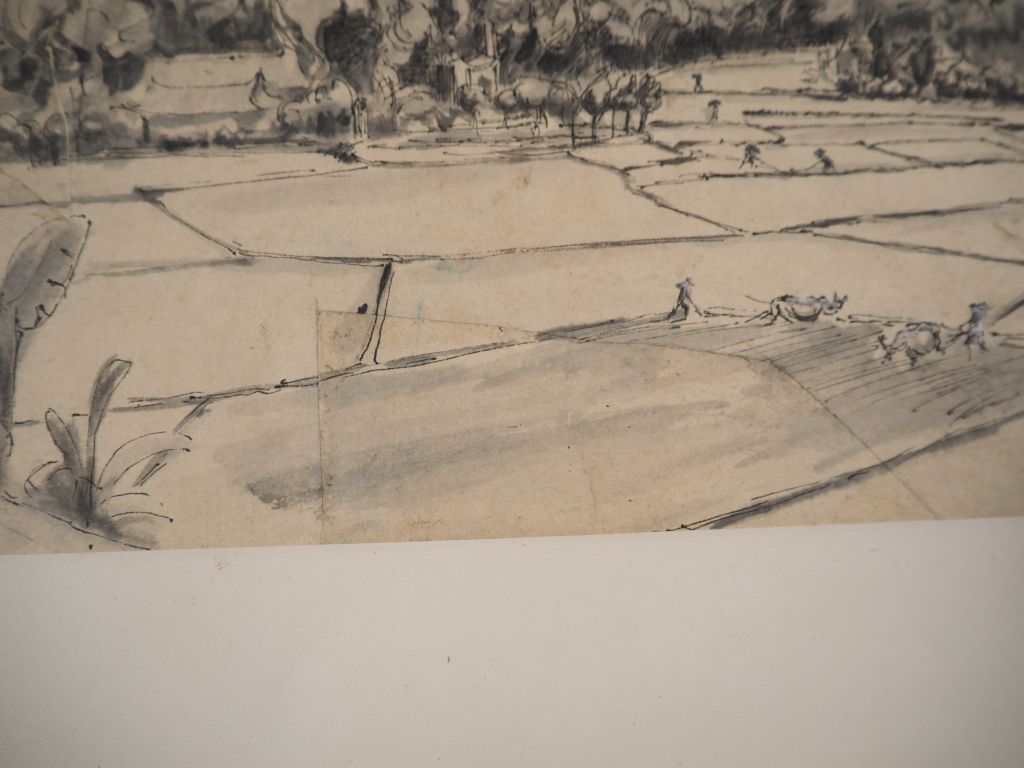 Louis Robert BATE (1898-1948, grand prix de l'Indochine en 1938). "Paysage de rizières animées". Encre et aquarelle sur papier signée en bas à droite. Dim. 19,5 x 33 cm.