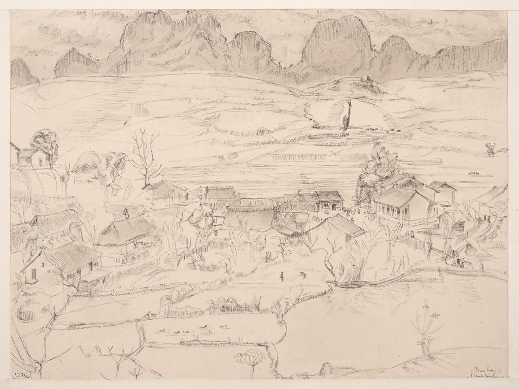 Louis Robert BATE (1898-1948, grand prix de l'Indochine en 1938). "Paysage, Ban Cra Haut Tonkin". Encre sur papier signée en bas à gauche et située en bas à droite. Dim. 25,5 x 34,5 cm.