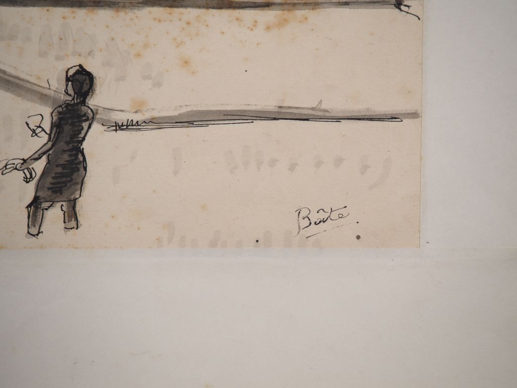 Louis Robert BATE (1898-1948, grand prix de l'Indochine en 1938). "Paysans dans les rizières d'Indochine". Encre et aquarelle sur papier signée en bas à droite. Dim. 31 x 44 cm. (Rousseurs).