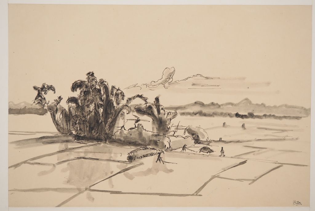Louis Robert BATE (1898-1948, grand prix de l'Indochine en 1938). "Rizières animées". Encre et aquarelle signée en bas à droite. Dim. 24 x 36 cm.