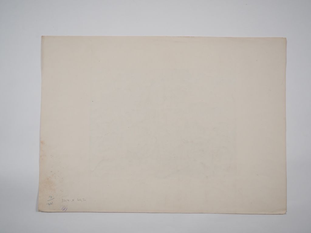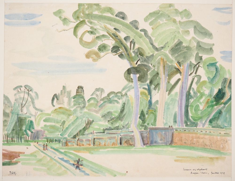 Louis Robert BATE (1898-1948, grand prix de l'Indochine en 1938). "Terrasse des éléphants, Angkor Thom juillet 1939". Encre et couleurs sur papier, signée en bas à gauche, titrée et datée en bas à droite. Dim. 30,5 x 40 cm.