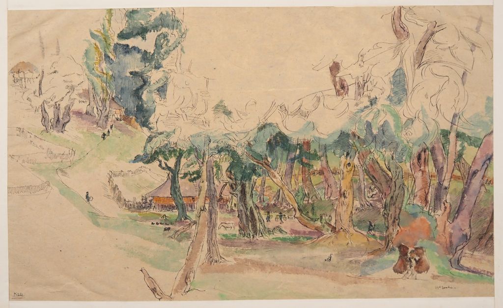Louis Robert BATE (1898-1948, grand prix de l'Indochine en 1938). "Village du Haut Tonkin dans un paysage de rizières arboré". Encre et aquarelle sur papier signée en bas à gauche et située en bas à droite. Dim. 34 x 56 cm.