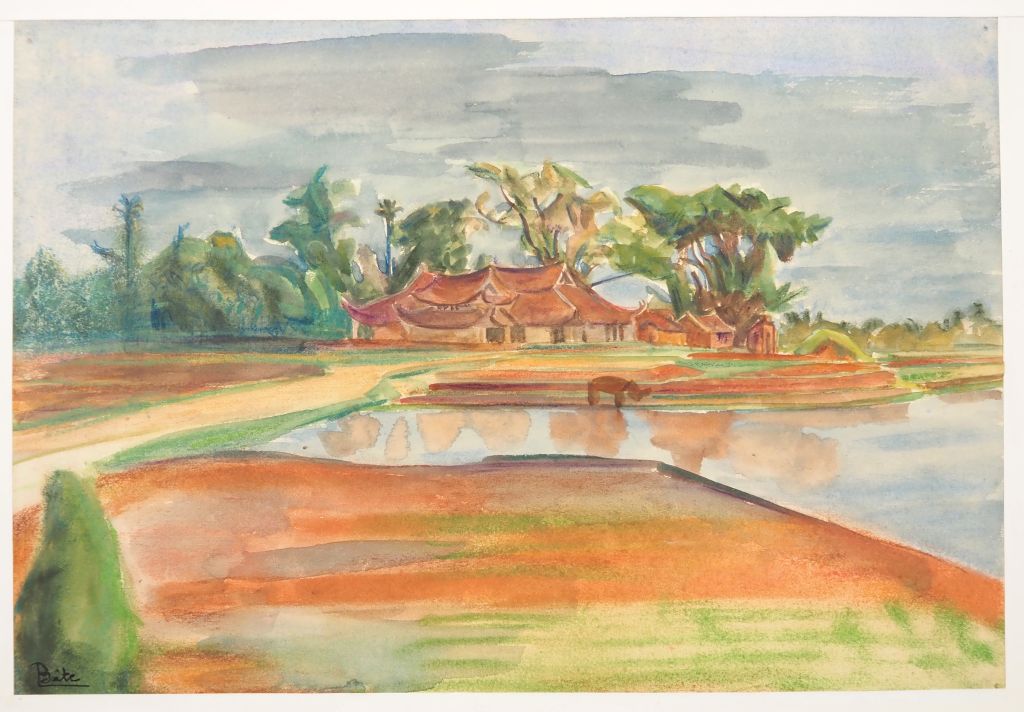 Louis Robert BATE (1898-1948, grand prix de l'Indochine en 1938). "Village et rizières en Asie du sud". Aquarelle signée en bas à gauche. Dim. 25 x 36 cm.
