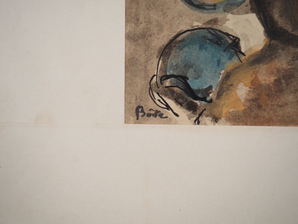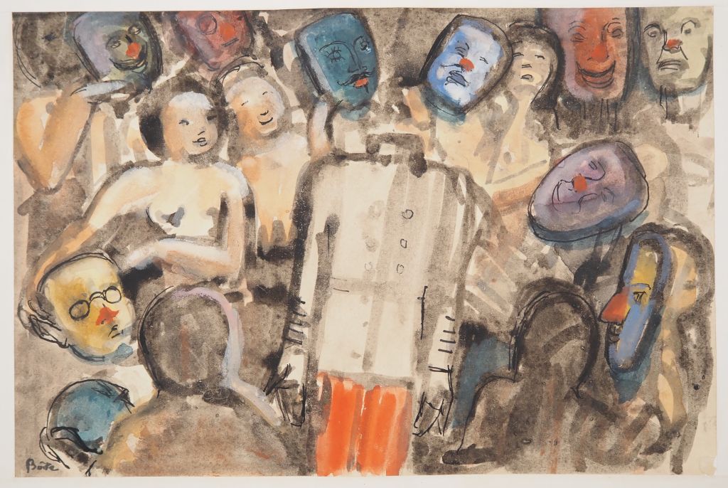 Louis Robert BATE (1898-1948, grand prix de l'Indochine en 1938). "Visages et masques d'Asie". Encre et aquarelle sur papier signée en bas à gauche. Dim. 22 x 32,5 cm.