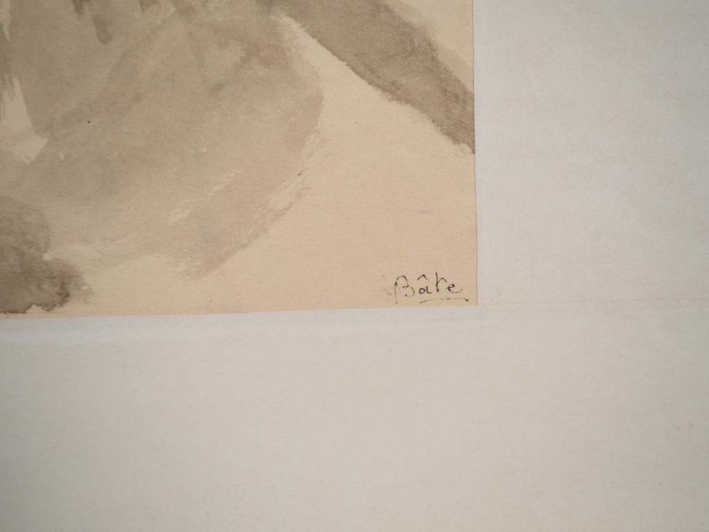 Louis Robert BATE (1898-1948, grand prix de l'Indochine en 1938). "Vue de pagode depuis la forêt" . Encre et aquarelle sur papier signée en bas à droite. Dim. 35 x 48,5 cm.