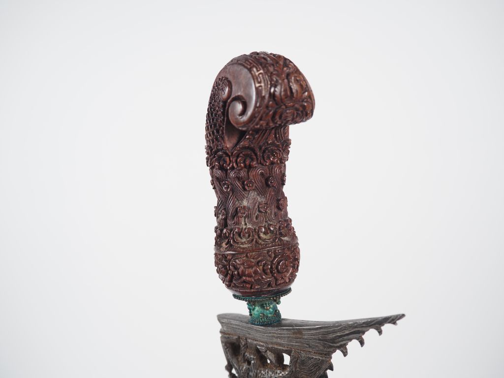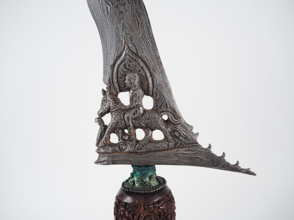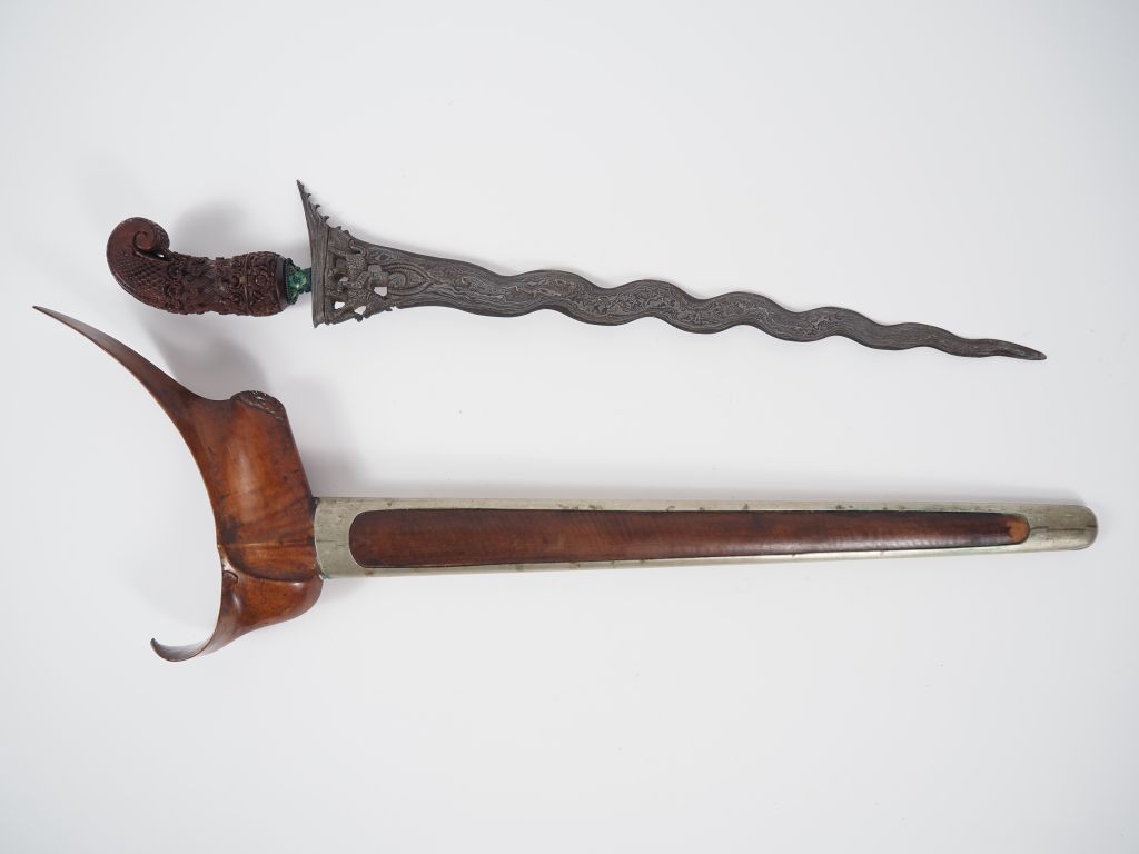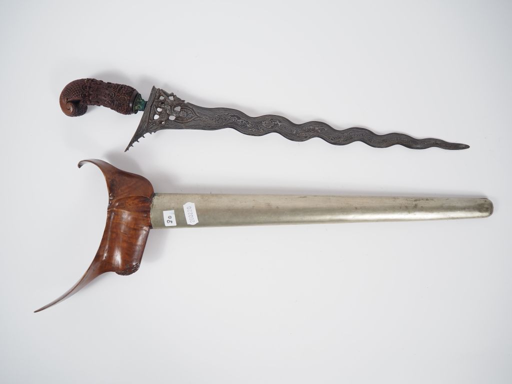 Malaisie, fin XIXe-début XXe Poignard dit « kriss » la poignée et le warangka en bois de belle patine. Le fourreau en bois et recouvert de métal argenté. Lame en acier ondulée à pamor aléatoire. L. 52 cm