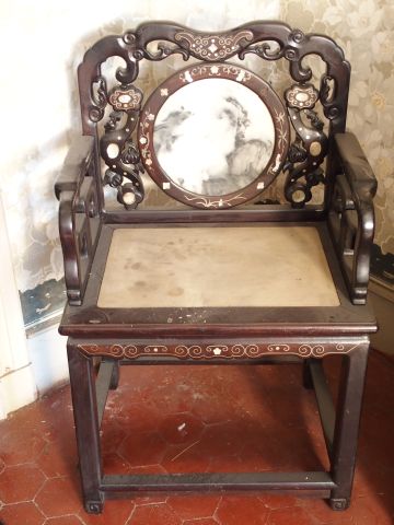 Mobilier de salon en acajou ou bois exotique, à décor sculpté de dragons stylisés, incrustrations de nacre, orné de marbre gris ou de pierres de rêve comprenant 6 fauteuils et un grand canapé. Chine du Sud. XIXème