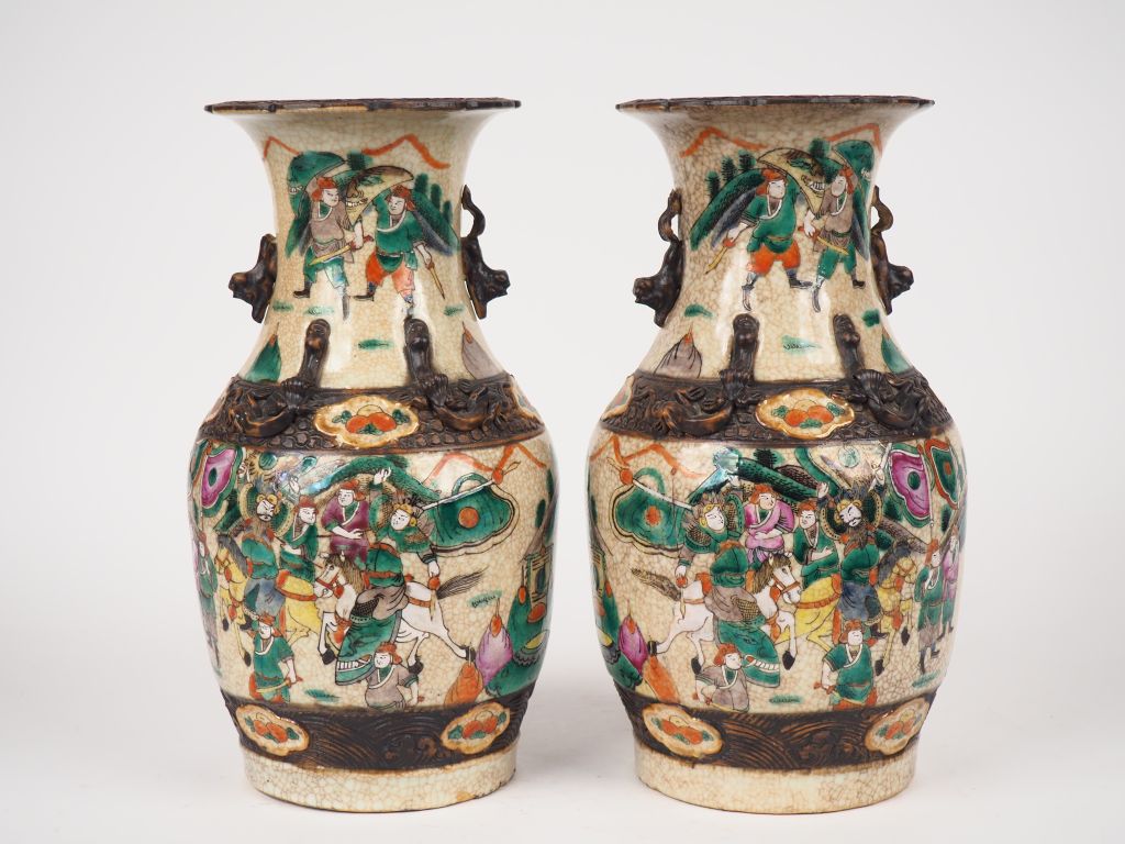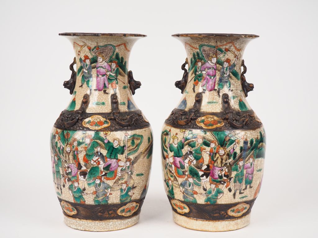 Nankin, vers 1920, Paire de vases de forme balustre en porcelaine de Nankin, à décor de guerriers. H.35 cm