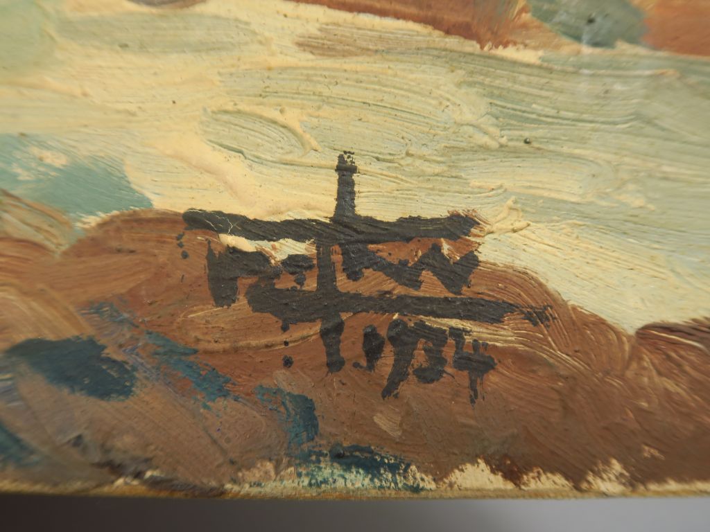 Nguyen Mai Thu "Buffles au milieu d'une rivière traversant un village entouré de pics montagneux" Huile sur toile. Signée en bas à droite et datée 1934. 70 x 98 cm