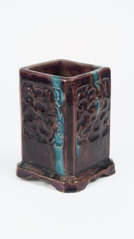 Objet de lettré : pot à pinceau carré en céramique émaillée bleu turquoise et manganèse, décor moulé sous couverte de motifs de fleurs et végétaux. Chine, XVIII ème siècle. H. 10,8 cm (Petites égrenures sur la base) 100/150