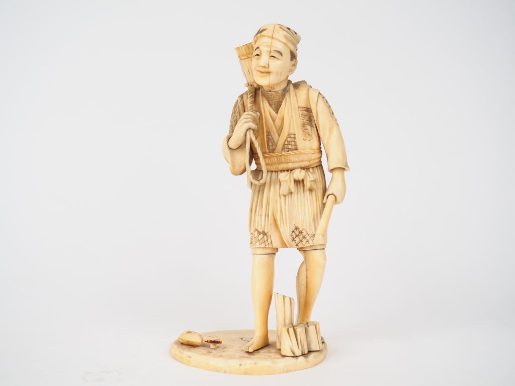 Okimono en ivoire du Japon XIXème "Bucheron" Poids : 460 g H. 21,5 cm (manques) Nom scientifique de l’ivoire : ivoire d’éléphant Elephantidae spp (I/A, pré-convention), spécimen antérieur au 1er juin 1947 et conforme à la réglementation CE 338/97 du 09/12/1996, art. 2-W mc. Pour une sortie de L’UE, un CITES de ré-export sera nécessaire, celui-ci étant à la charge de l’acquéreur.